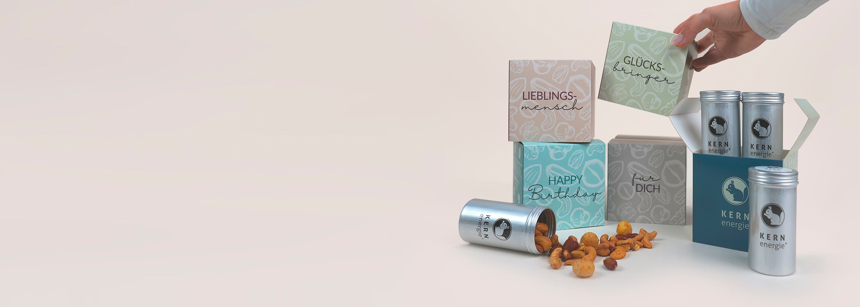 Du möchtest Vielfalt auf einen Blick, perfekt portioniert, hochwertig verpackt und ideal zum Verschenken oder Selbstgenießen? Dann ist unser KERNenergie Box-Mixer genau das Richtige für Dich! Wähle zuerst Deine gewünschte Box. Anschließend stellst Du Deine individuelle Box aus vier Dosen zusammen, genau nach Deinem Geschmack. Ob knackige Nüsse, fruchtige Highlights oder schokolierte Spezialitäten: Du entscheidest, was in Deine persönliche Nussbox oder Geschenkset kommt. Das Highlight: Du kannst aus verschiedenen stilvollen Geschenkbox-Designs mit liebevoller Botschaft wählen. Ob „Gute Besserung“, „Für Dich“, „Glücksbringer“ oder „Lieblingsmensch“ – so wird der Box-Mixer zur perfekten Geschenkidee zum Geburtstag, als individuelles Geschenk oder einfach als kleine Geste zwischendurch. Egal ob als Geschenke für Männer, Geschenke für Frauen, Geschenk für Freundin oder generell als Geburtstagsgeschenk.
