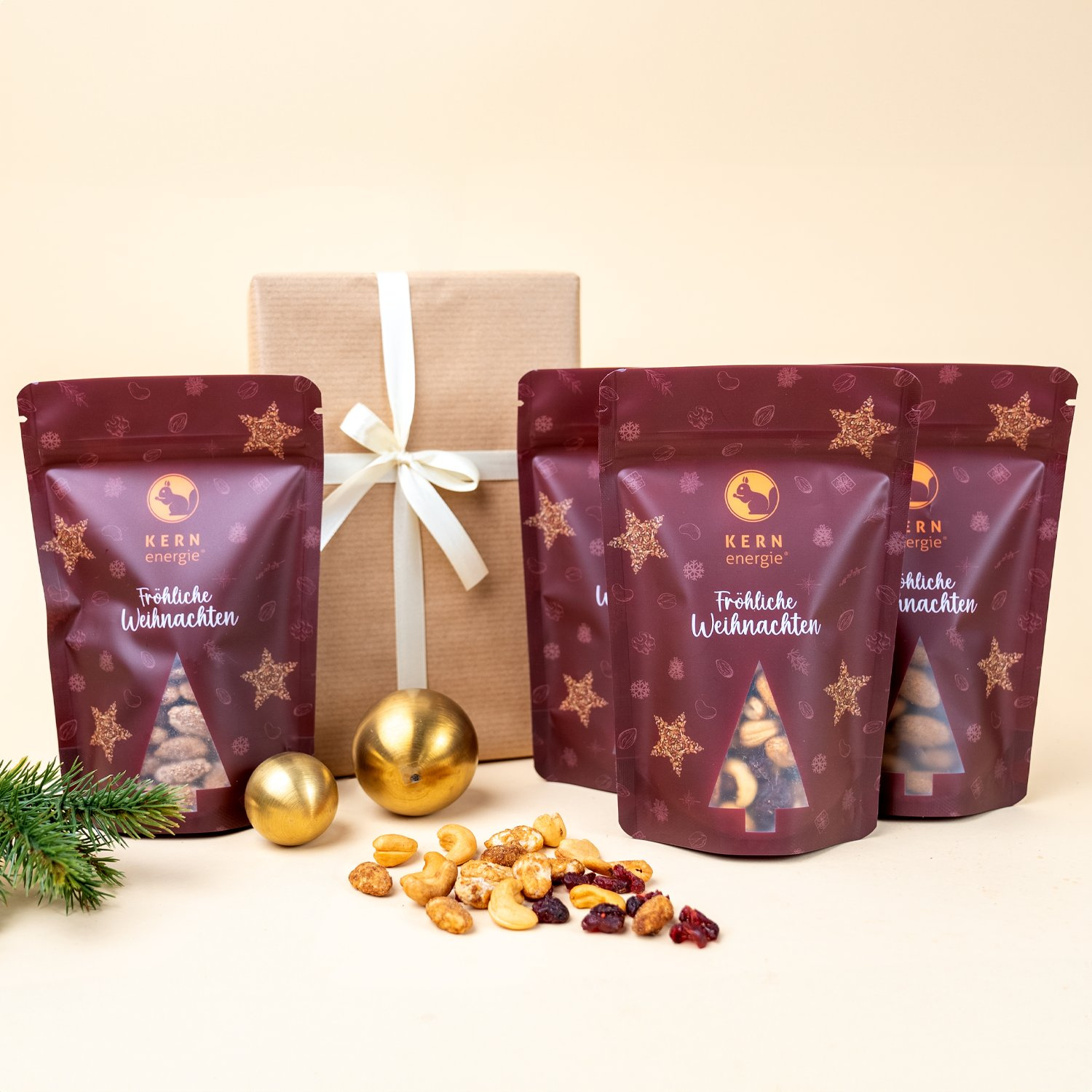 - 180g bis 250g Standbodenbeutel: Diese Standardgrößen sind perfekt für die Verpackung von größeren Mengen, z.B. handgerösteten Nüssen oder Snackmischungen als Mitarbeitergeschenk oder im Retailbereich.