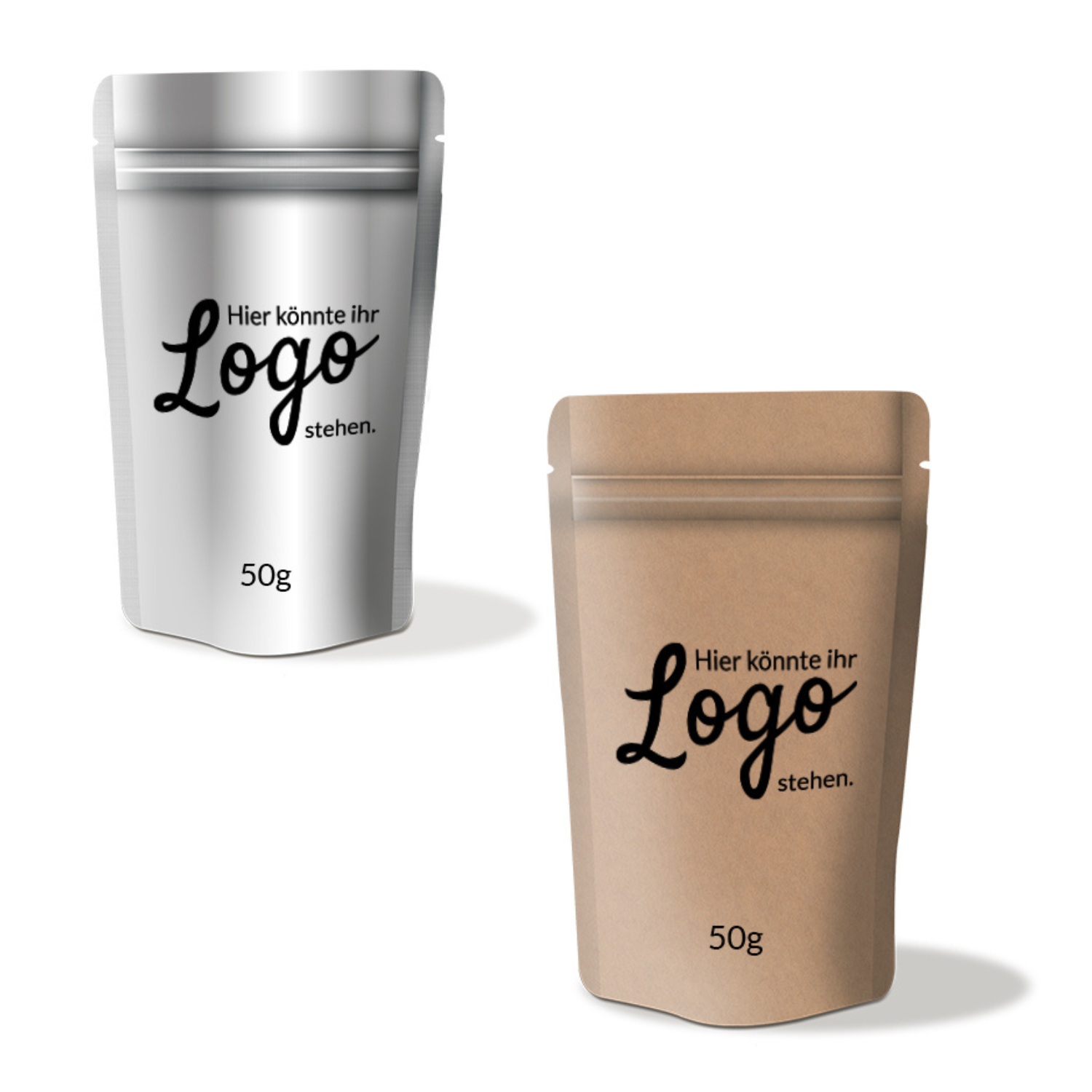 - Ab 250 Stück: Für kleinere Bestellungen können unsere 50g-Beutel mit einem hochwertigen Etikett versehen werden, das Ihr Logo oder eine spezielle Nachricht trägt.